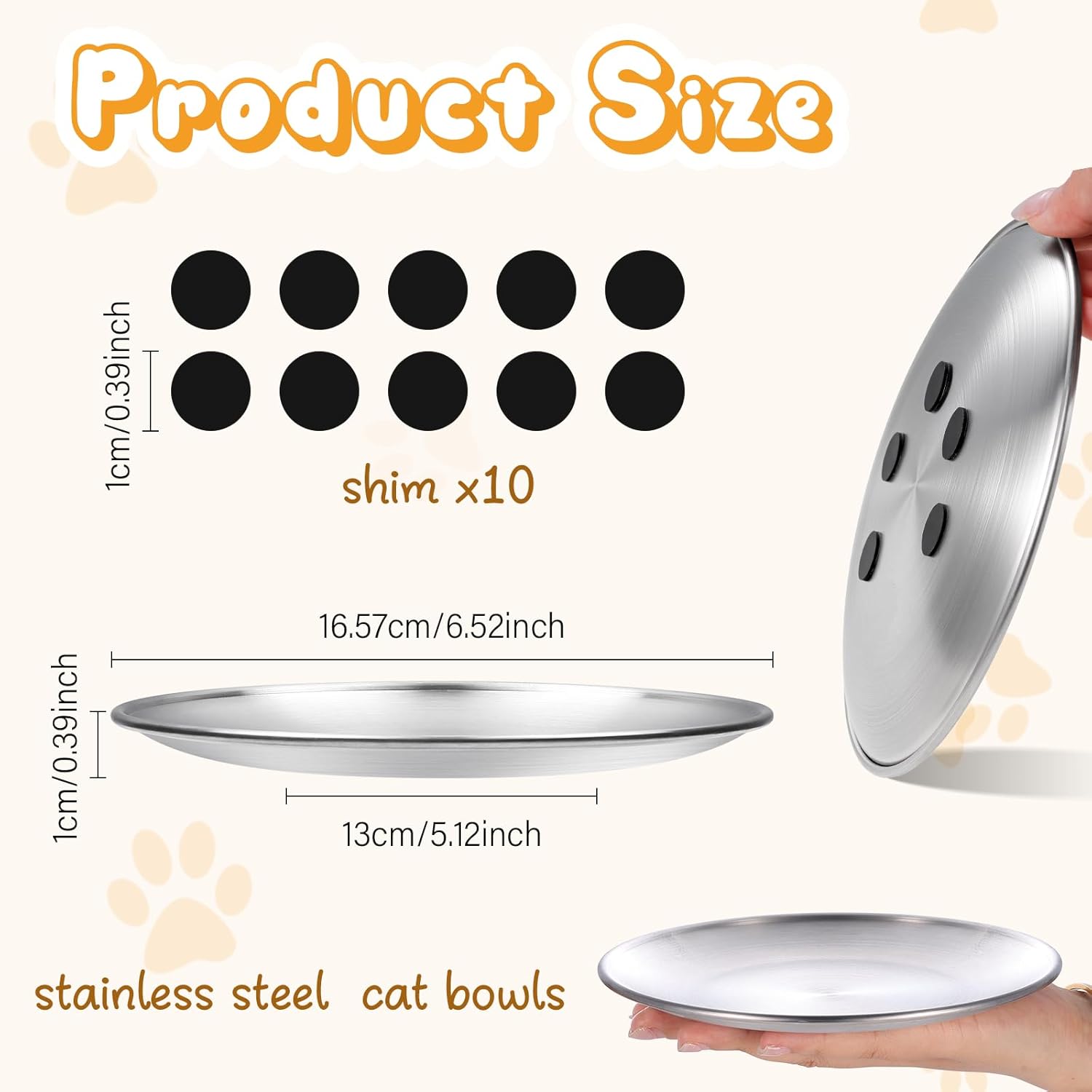 Package Include: The package include 2 pack stainless steel shallow cat plates, and 10 pack non-slip silicon pads, the size is about 6.52 inches in mouth diameter, 5.12 inches in bottom diameter, 0.39 inches in depth. Each cat bowl is lightweight, allowing you take it with you on short trips or camping, more convenient to feed your pet