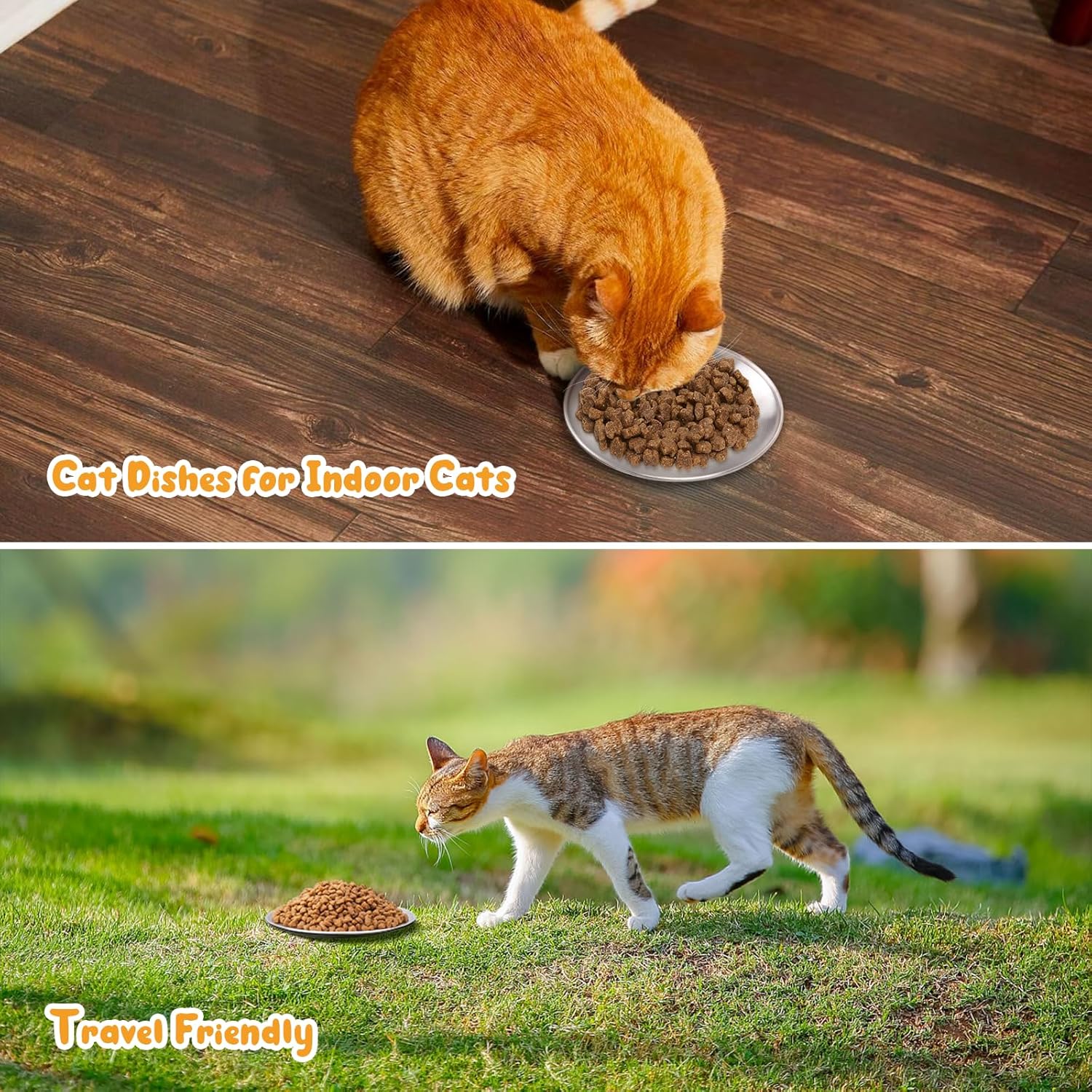 Non-slip Pads & Stackable: Our shallow pet bowls are equipped with non-slip silicone pads to prevent the bowl from sliding or spilling while your cat is eating, it can reduce noise and protect the floor from scratches. These cat dishes for indoor cats are stackable, easy to take with you on the go and save space, dishwasher safe at home, just wash with water when camping outdoors
