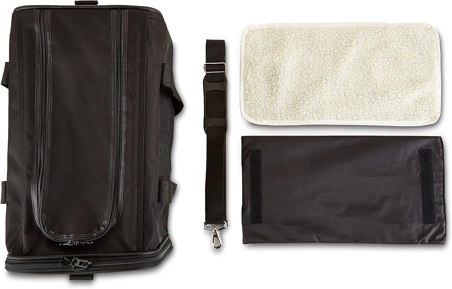 Includes a Medium soft-sided carrier with a removable, machine washable fleece pad