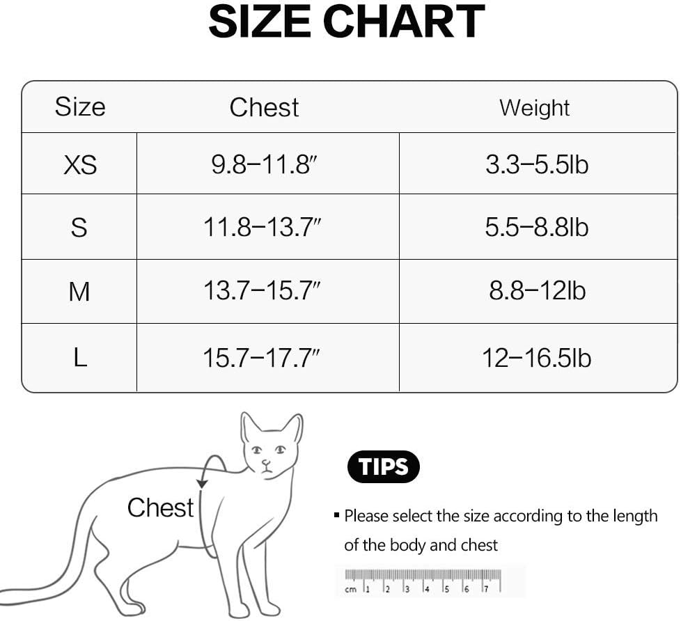 5.Size : XS: Chest:9.84-11.81″/25-30cm Recommended weight:3.3-5.5 lb/1.5-2.5kg S: Chest:11.81-13.78″/30-35cm Recommended weight:5.5-8.8 lb/2.5-4kg M: Chest:13.78-15.75″/35-40cm Recommended weight:8.8-12.1 lb/4-5.5kg L: Chest:15.75-17.72″/40-45cm Recommended weight:12.1-16.5 lb/5.5-7.5kg