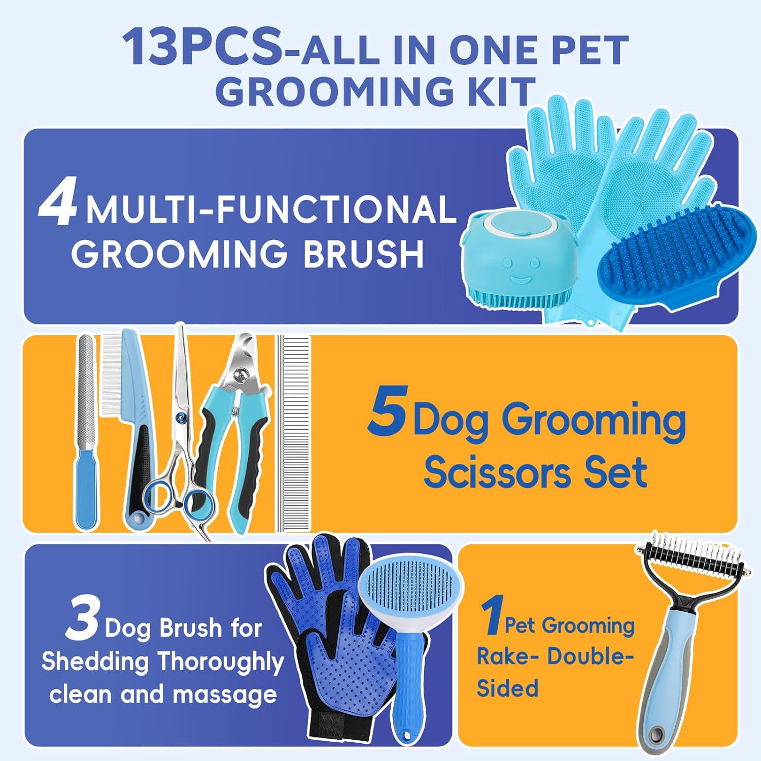 Dog Brush, 13Pcs Pet Grooming Kit with Deshedding Brush for Dogs and Dog Nail Clippers, Cat Grooming Supplies with Pet Hair Removal Gloves, Dematting Comb Brush Shampoo Scrubber for Short & Long Haired Dogs / Cats