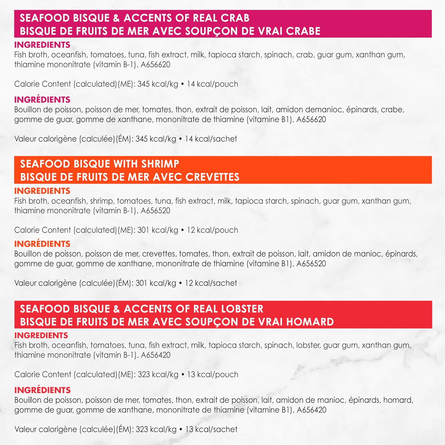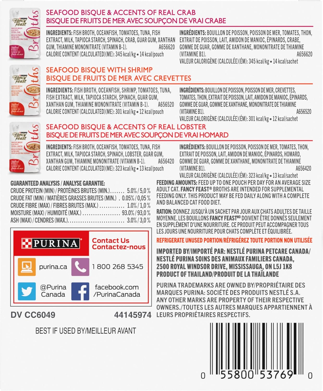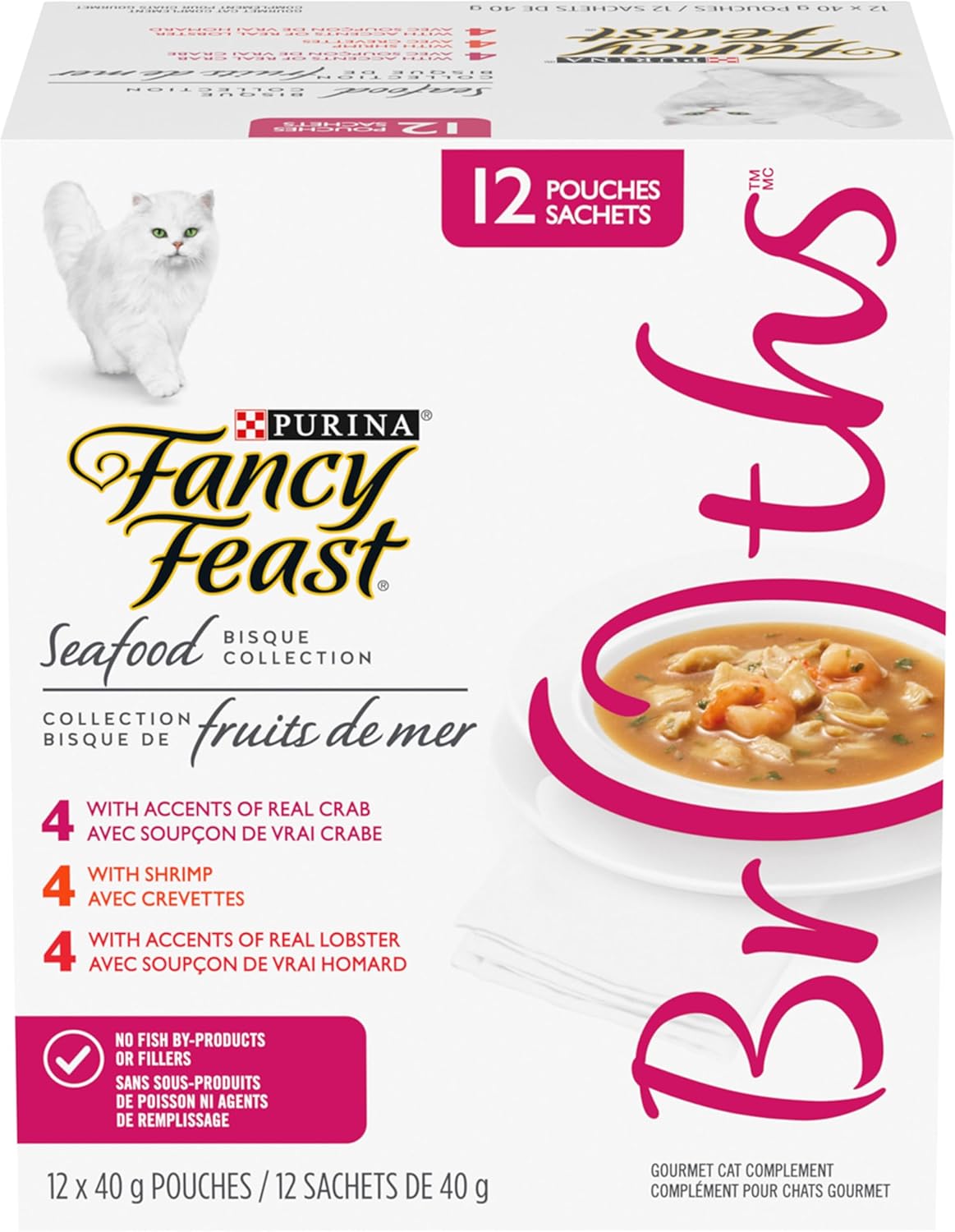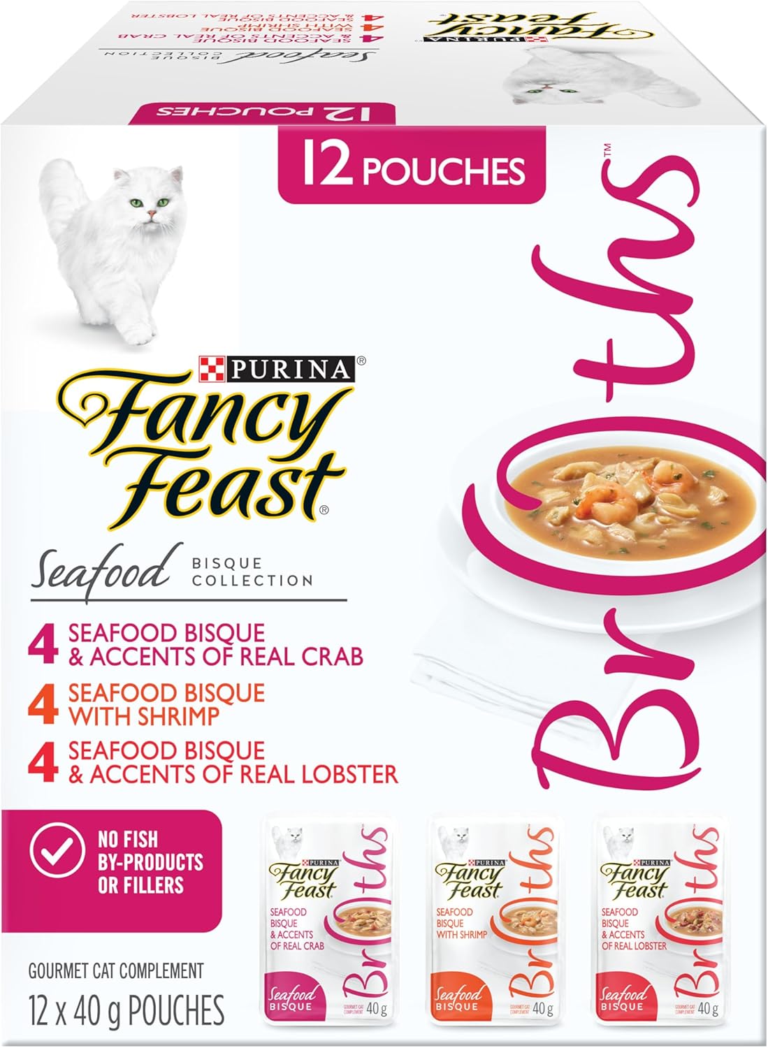 Fancy Feast Broths Cat Food Complement, Seafood Bisque Collection Variety Pack 3 Flavours – 40 g Pouch (12 Pack)