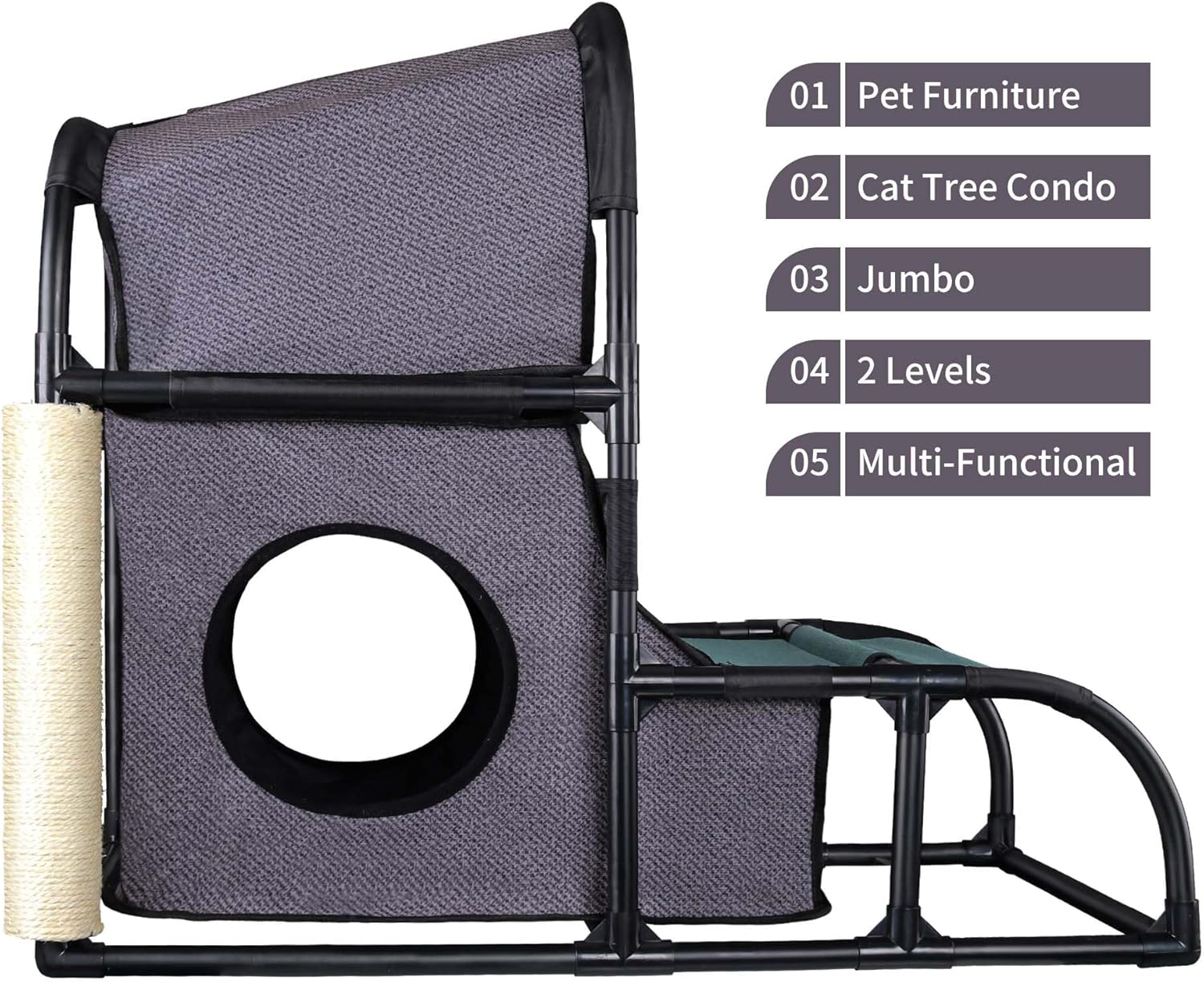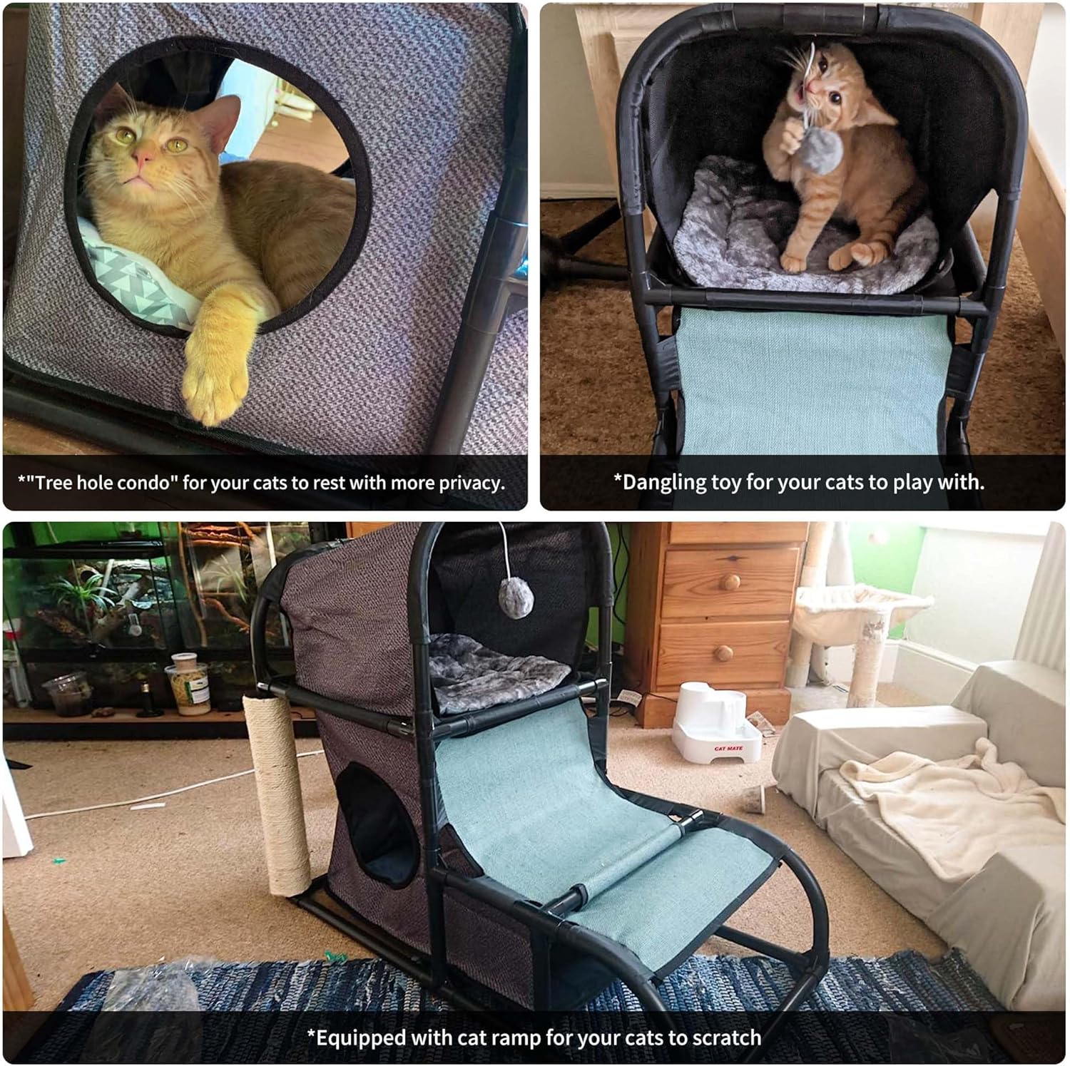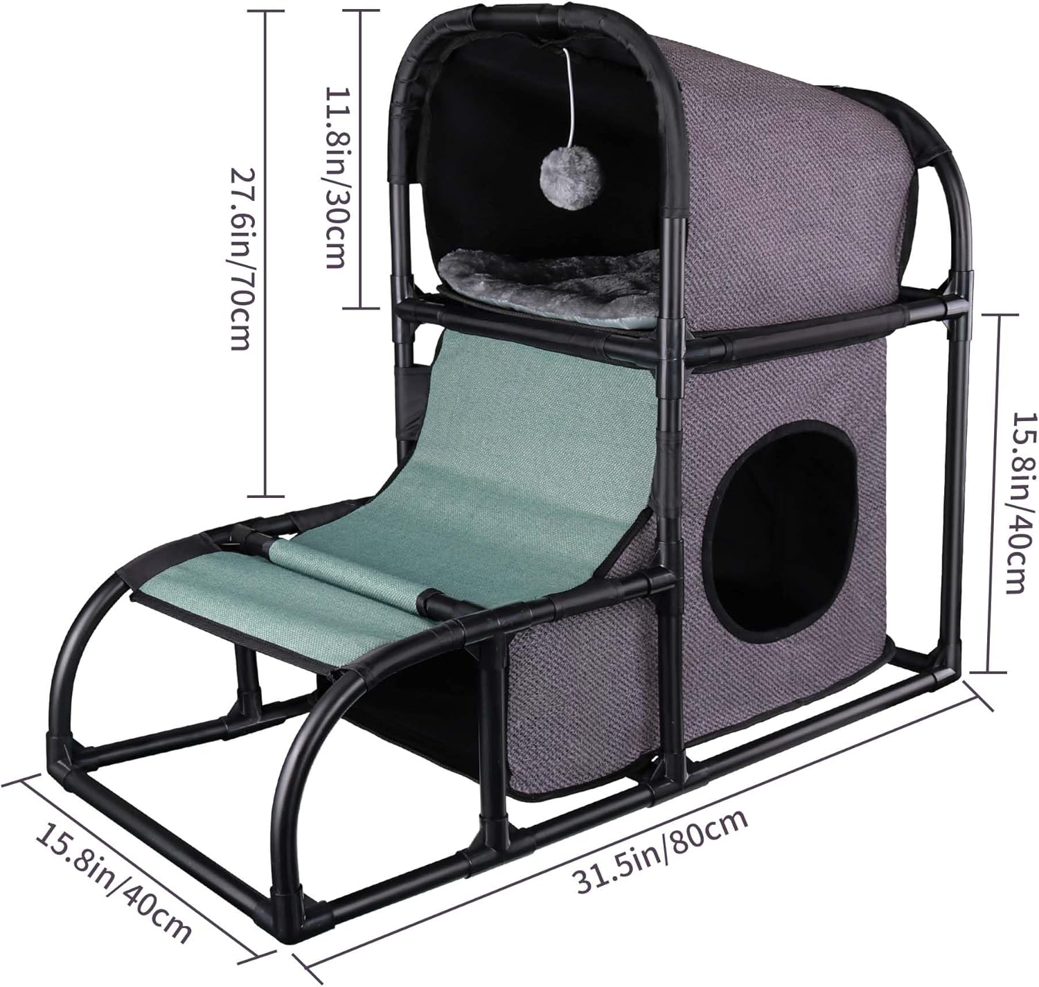 5 active areas: sleeping area, cat house, climbing ladder, scratching post, lay-on platform. Soft plush cushion to keep your cat warm and comfortable. Climbing ladder allow your cat to fully release energy and entertain itself