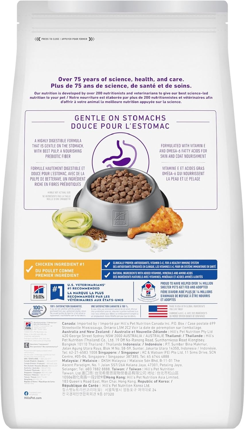 Hill’s Science Diet Adult Sensitive Stomach & Skin Chicken Recipe dry dog food is specially formulated for optimal digestive health. This dog food for sensitive stomachs uses prebiotic fiber to fuel gut bacteria and support a balanced microbiome. In addition, this dry dog food is made with natural ingredients with added vitamins, minerals and amino acids. This food is an excellent source of vitamin E and Omega-6 fatty acids to nourish the dog’s skin, and help maintain a healthy, shiny coat. This nutrition is formulated with decades of cutting-edge research to be a great-tasting meal for adult dogs.