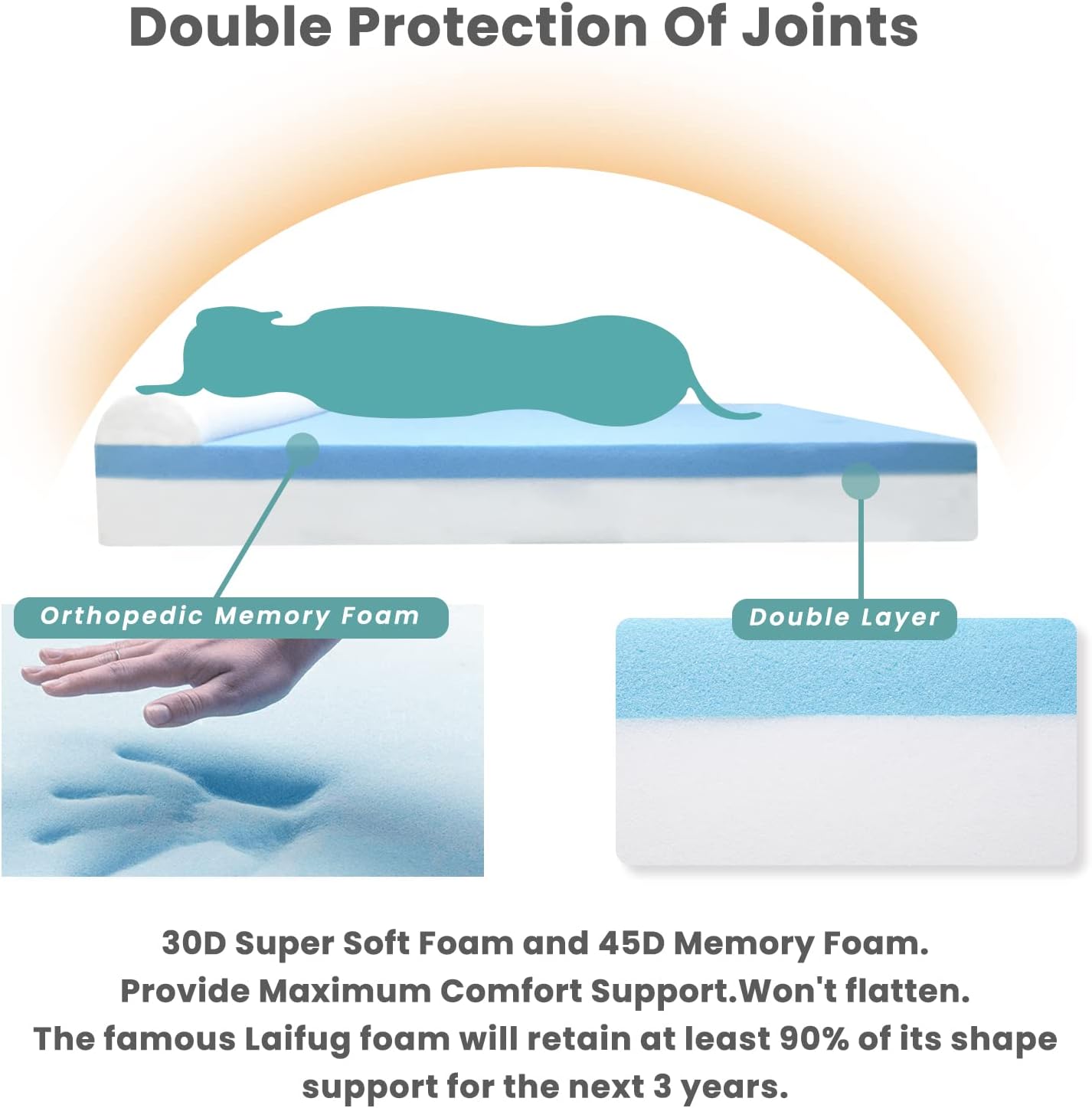 Orthopedic memory foam:Super high-quality memory foam. Provide maximum comfort & support. Won’t flatten. The famous Laifug foam will retain at least 90% of its shape & support for the next 3 years