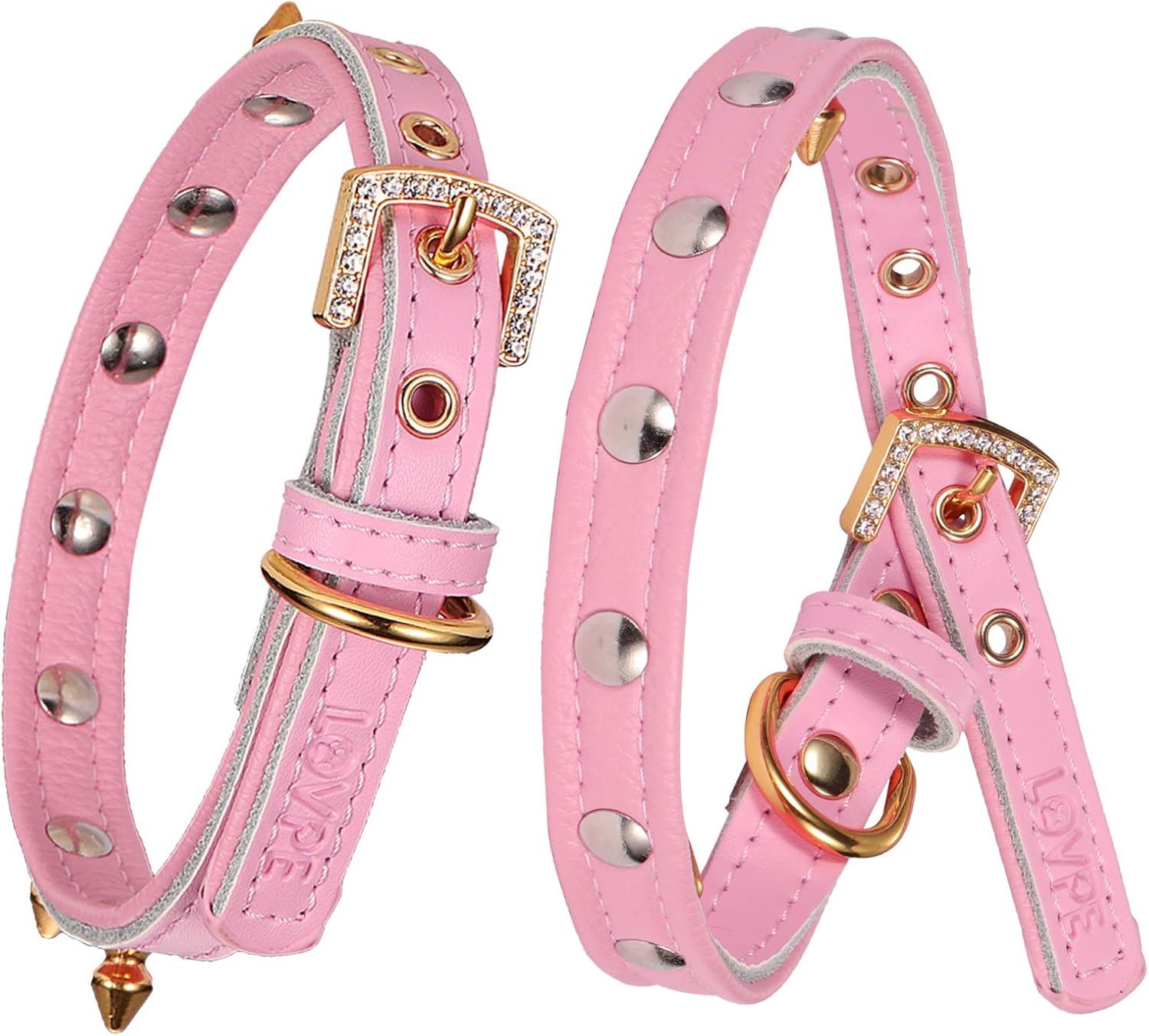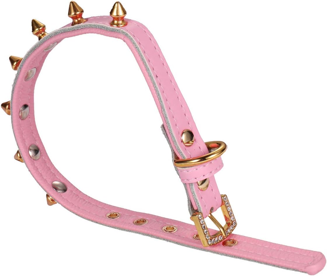 LOVPE Cat Collar/Dog Collar Golden Spiked Studded Double Layer Leather Pet Collars with Golden Rhinestone Buckle for Cats Puppy Small Medium Dogs (XS(Neck for:8-11 Inch), Pink)