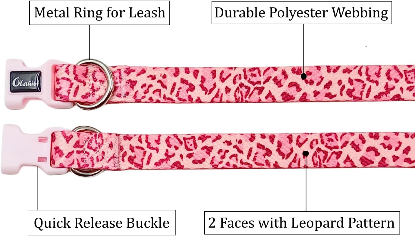 Olahibi Dog Collar Leash Set, Leopard Pattern, Polyester Material, 5ft Matching Leash, for Small Dogs.(S, Pink Leopard)