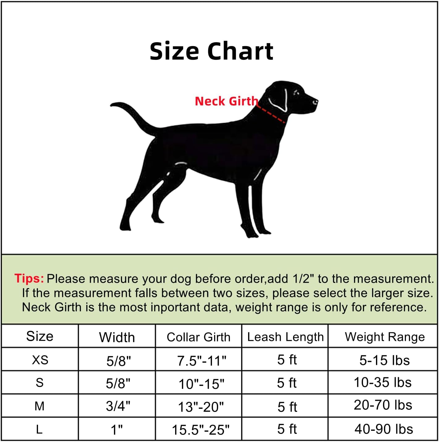 Please measure your dog’s neck circumference before ordering, and add 1/2″ to make sure your dog feel comfortable.