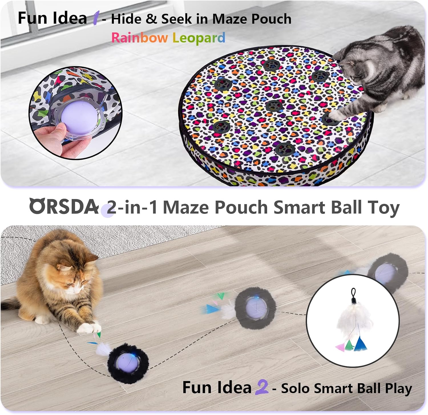【ORSDA 2-in-1 Upgraded Maze Pouch Smart Ball Toy】: This toy simulates the illusion of a mouse scurrying under a mat. The upgraded pouch design features five peek-a-boo mouse holes, let your cat to sneak a peek and paw at the “mouse holes” . Powered by a high-quality smart ball, it ensures strong driving force and sensitivity for engaging playtime.