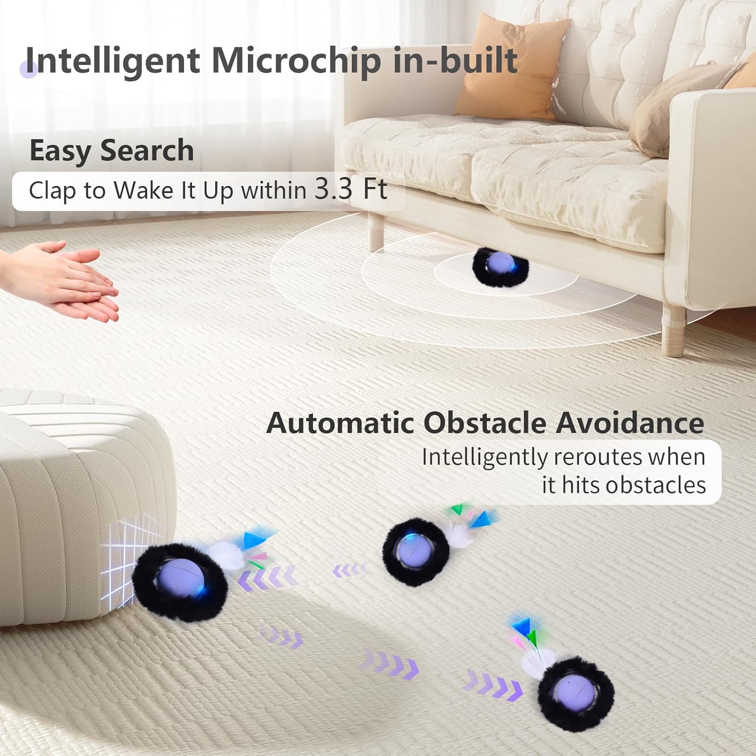 【Simply Clap to Find Lost Ball】: Worried about losing the cat toy ball? ORSDA’s smart ball is equipped with a highly sensitive sound-activated chip. Simply clap within about 3.3Ft range, and it will start moving again. Plus, it has an automatic obstacle avoidance function to prevent it from getting stuck under the sofa or bed.