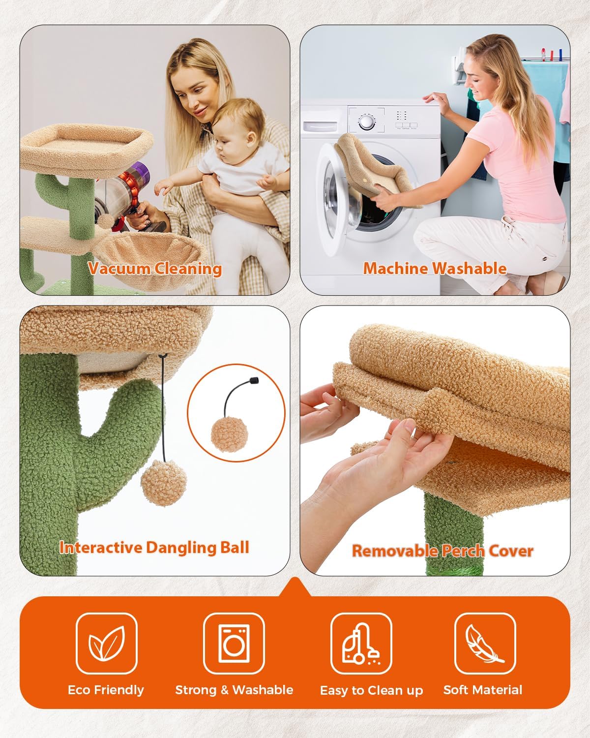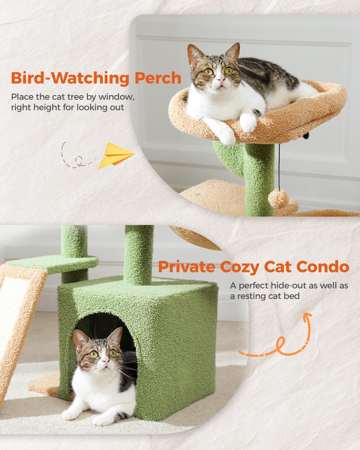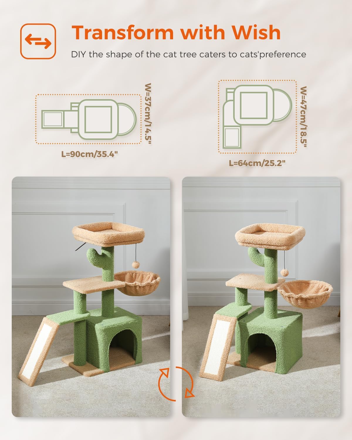 Compact and Stylish: You can change the direction of the scratching ramp to to fit in any space without compromising on fun and functionality. The stylish cactus cat tree design adds a touch of whimsy to your home decor.