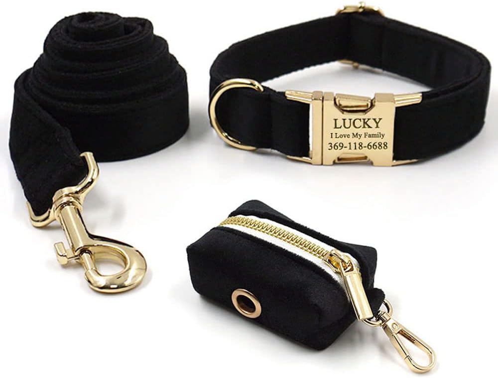PETDURO Custom Dog Collar Personalized with Name Engraved Gold Metal Buckle for Large Medium Small Boy and Girl Dogs – Dog Leash and Bow Tie Set Available – Soft Comfy Velvet (Black G, M)