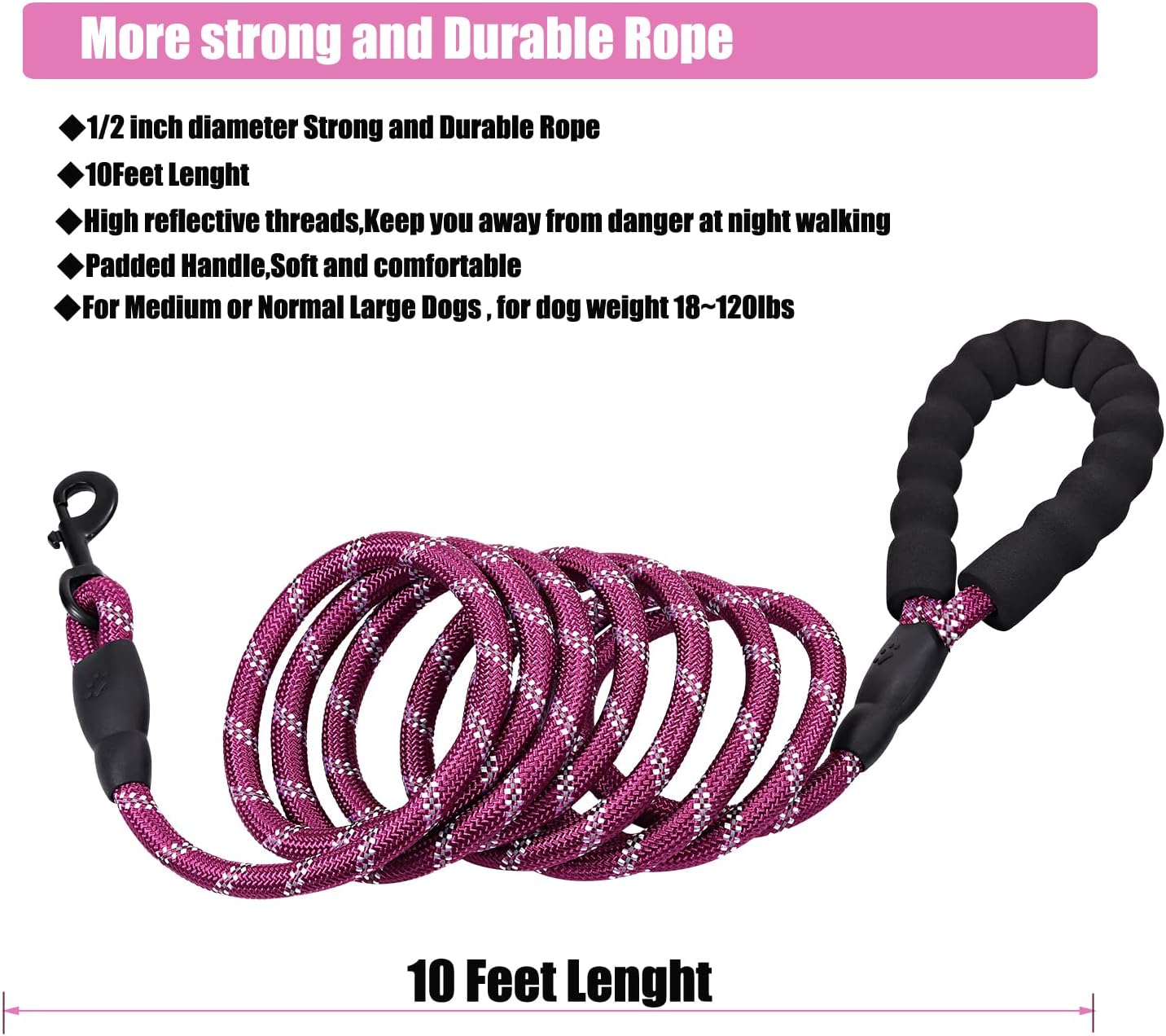10 FT REFLECTIVE DOG LEASH: 1/2 inch diameter strong nylon rope and solid tangle free clasp.suitable for large and medium breeds daily walking,training hiking and jogging.