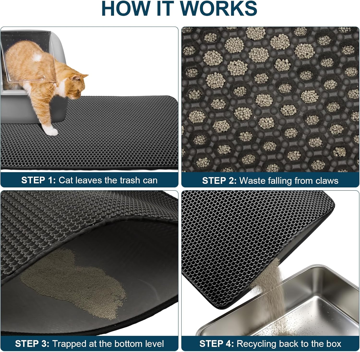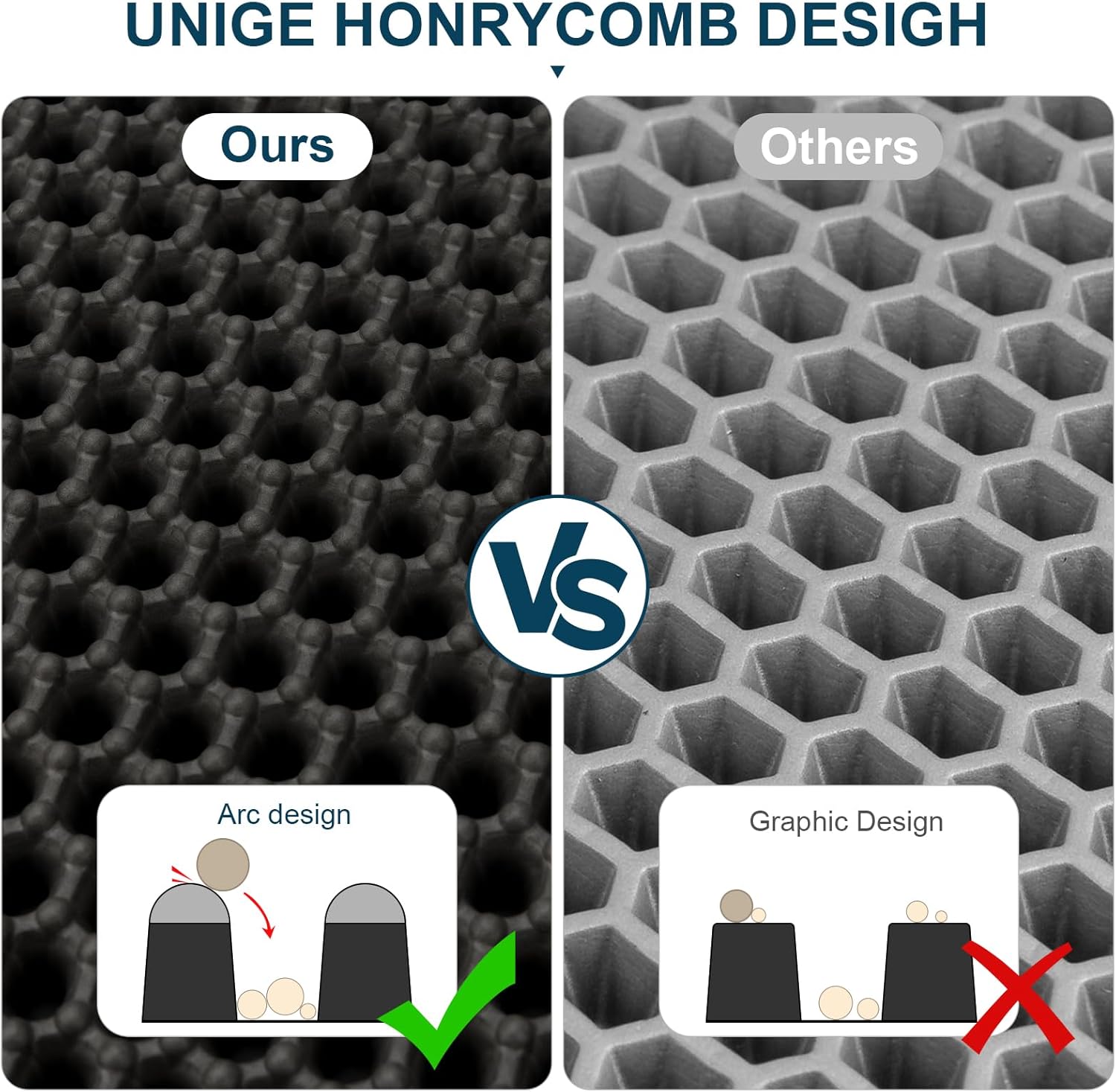 High Quality Mat for Gathering Litter: This cat litter trapper helps you to trap the scatter cat litter, no more getting litter stuck to your feet and cleaning your floor on daily basis! Our product is large enough to cover your cat’s litter box’s entrance area, and the honeycomb shape holes are extra large to cat and trap every cat litter.